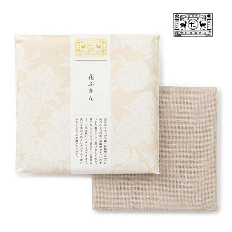 蚊帳生地を2枚重ねで縫い合わせてつくった、大判薄手な花ふきんは、 たたんで使うとよく水を吸い、広げて干せば乾くのがとても速い、シンプルですがすごく機能的なふきんです。 薄手でも、生地が丈夫だから長持ちするのも特徴です。ロングセラーの「花ふきん」が、色とパッケージを新たに登場。 日本らしい色合いに染めたかや織と品のあるたとう紙にすることで、贈答にふさわしい佇まいに。 こちらの花ふきんのたとう紙には、それぞれの色の花を描き、華やかさな装いに仕上げました。 麻素材の花ふきんのほかに、白百合(シラユリ)、檜扇(ヒオウギ)、水仙(スイセン)、柳(ヤナギ)、竜胆(リンドウ)、小手毬(コデマリ)の6色の花ふきんもご用意いたしました。 インテリアの差し色になるような、彩り豊かなラインアップです。鮮やか過ぎず落ち着いた色味ですので、気軽な贈りものとして、手土産はもちろん新築祝いなどにもおすすめです。奈良県の特産品である「かや織」を2枚重ねて縫い合わせたふきん。目が粗くて大判で薄手のふきんは、畳んで使うと吸水性に優れ、広げて干すとすぐに乾いて便利です。水分を含むと強くなる、天然繊維の「綿」と「麻」。その素材を使うのは、長く使ってほしいという想いからです。洗いをかさねていくことで柔らかく優しい肌ざわりになります。使うほどにふわふわになり、くたくたになるまでご愛用いただけます。ふきん以外にもお弁当包みや出汁漉し、野菜の水気取りなどさまざまな用途にお使いいただけます。あなたの暮らしにあった使い方で、ぜひご愛用ください。