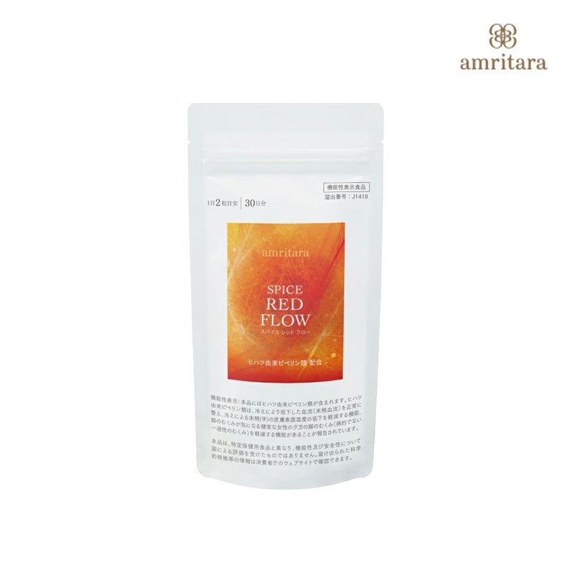 スパイス レッド フローに含まれる「ヒハツ由来ピペリン類」は、栽培期間中に農薬を使用しないで育ったヒハツから抽出した成分で、冷えにより低下した末梢の血流を整え、末梢(手)の皮膚表面温度の低下を軽減し、また女性の夕方の脚のむくみを軽減する機能があることが報告されています。