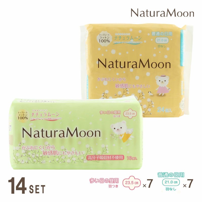 ナチュラムーン 生理用ナプキン 昼用×14パックセット(多い日の昼用羽つき7パック、普通の日用羽なし7パック)